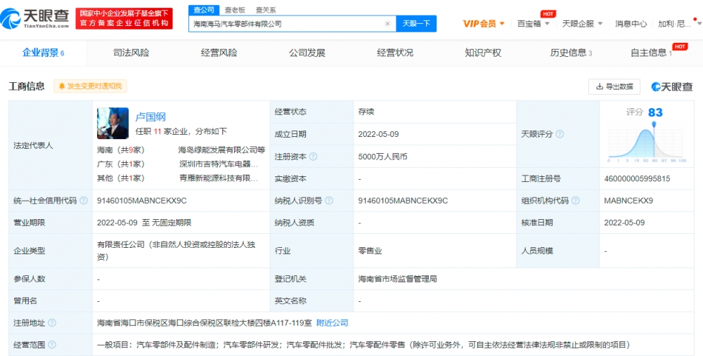 鞭牛士 5月11日消息,天眼查App显示,近日,海南海马汽车零部件有限公司成立,法定代表人卢国纲,注册资本5000万人民币。