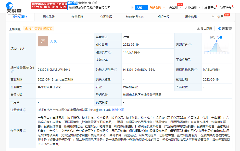 鞭牛士 5月20日消息,天眼查App显示,5月19日,杭州樱龙弦月品牌管理有限公司成立,注册资本100万人民币,法定代表人方剑,经营范围含品牌管理;文化娱乐经纪人服务;鞋帽批发;鞋帽零售;在线数据处理与交易处理业务等。股东信息显示,该公司由王文菊、黄子韬关联公司海南永恒星龙文化发展集团有限公司、星期六女鞋关联公司杭州遥望网络科技有限公司共同持股。