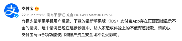 鞭牛士 5月28日消息,昨日晚间,支付宝官微发布公告称,有极少量苹果手机用户反馈,下载的最新苹果版(iOS)支付宝App存在页面图标显示不全的情况,这个情况已经在逐步修复中。给大家造成体验上的不便深感抱歉。请放心,支付宝App各项功能使用和账户资金安全均不会受影响。