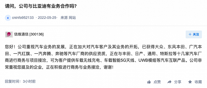 鞭牛士 5月29日消息,信维通信今日在深交所“互动易”平台回答投资者提问称:公司重视汽车业务的发展。
