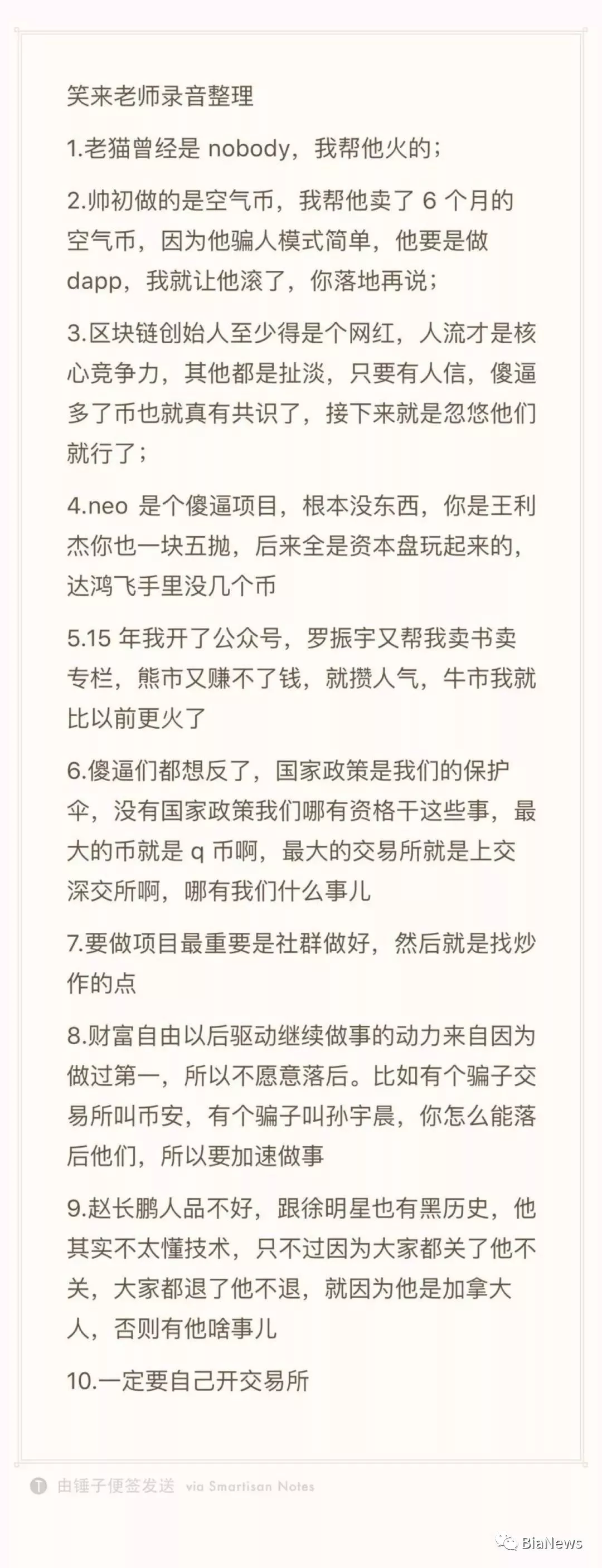 直到近期,笑来老师的录音曝光,内容可谓猛料巨多。谈话内容涉及众多区块链项目以及币圈大佬,包括老猫、neo、以太坊、Ripple、罗振宇、赵长鹏等。