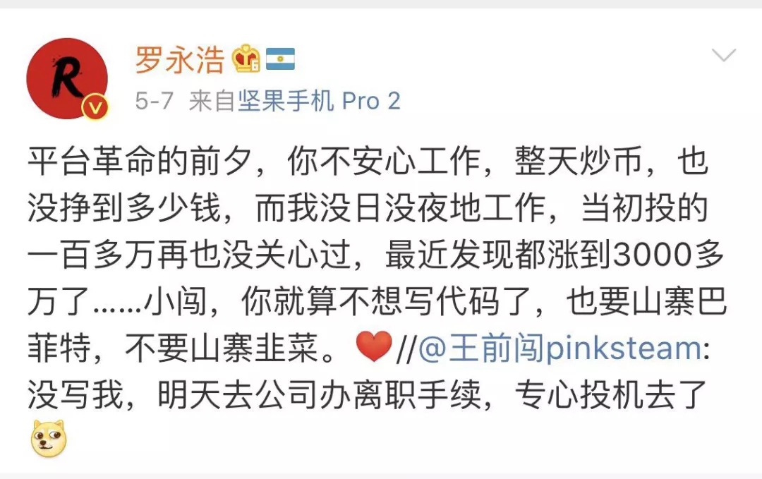 当手下看到币圈的人赚的钵满盆满流口水不想工作专心投机去时,老罗及时阻止这种坏风气、坏现象,直接炫耀自己炒币100多万涨到3000多万。