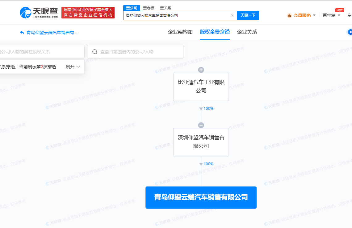 股权全景穿透图显示,该公司由深圳仰望汽车销售有限公司全资持股,后者为比亚迪汽车工业有限公司全资子公司。