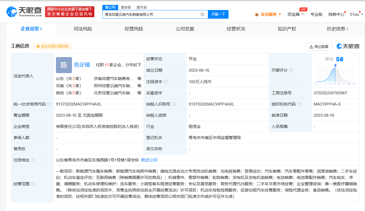 天眼查App显示,近日,青岛仰望云端汽车销售有限公司成立,法定代表人为陈足稽,注册资本100万人民币,经营范围包括新能源汽车整车销售、新能源汽车电附件销售、插电式混合动力专用发动机销售、充电桩销售等。