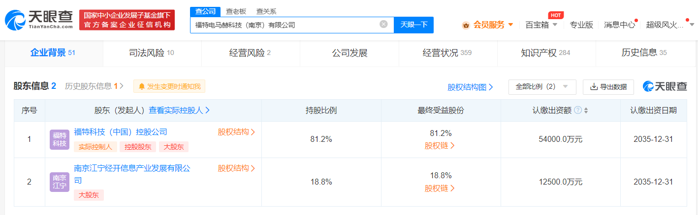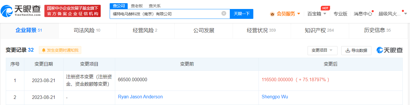 天眼查App显示,近日,福特电马赫科技(南京)有限公司发生工商变更,注册资本由6.65亿美元增至11.65亿美元,增幅超75%。