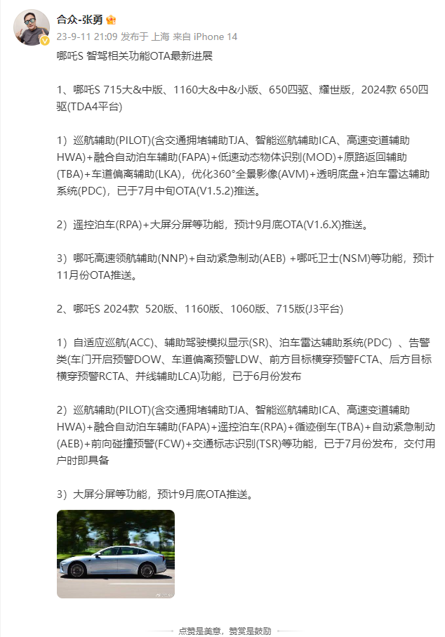 3)遥控泊车 (RPA) 等功能,原计划 10 月中下旬 OTA 推送,会同步新增哪吒卫士 (NSM)+ 大屏分屏功能,预计推迟至 11 月 OTA 推送。