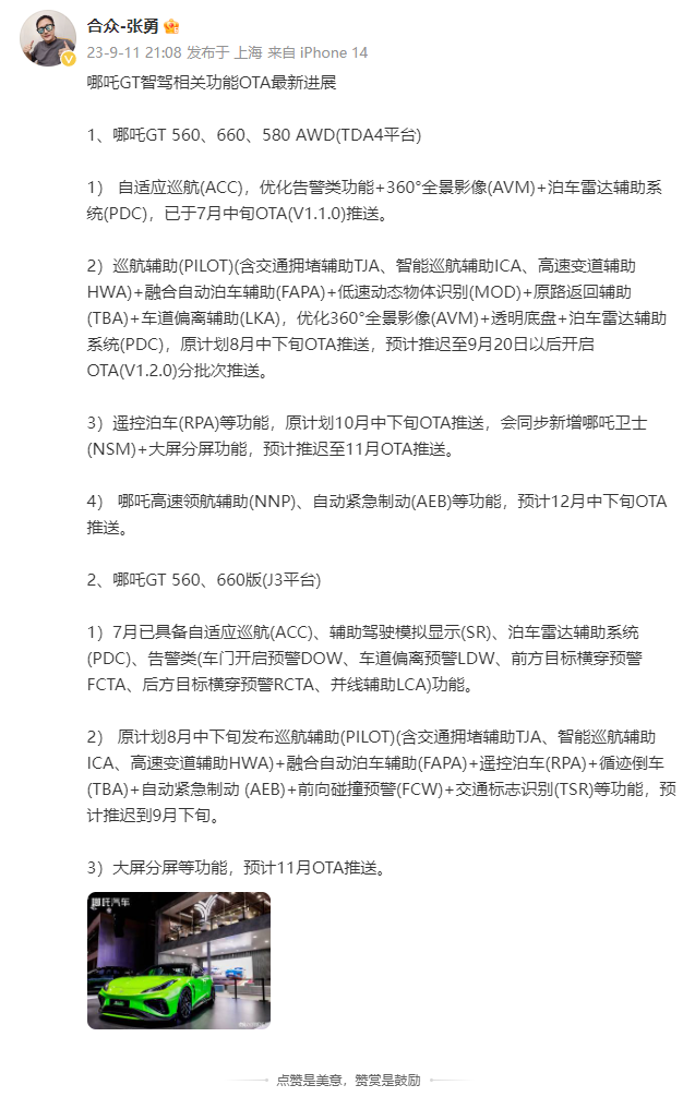 9 月 12 日消息,哪吒汽车 CEO 张勇分享了哪吒 S 和哪吒 GT 功能 OTA 最新进展。从高速领航辅助、遥控泊车、大屏分屏等功能的推送周期来看,哪吒 S 的进度都比哪吒 GT 稍快一些。