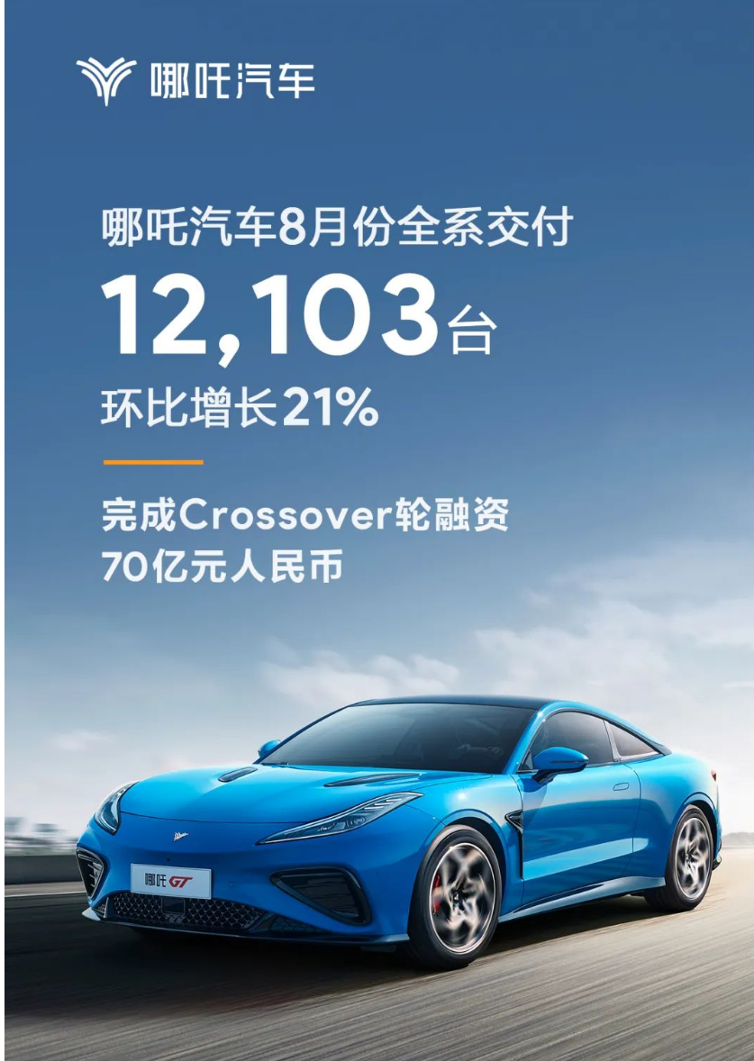 今年 8 月,哪吒汽车宣布全系交付 12103 台汽车,环比增长 21%。