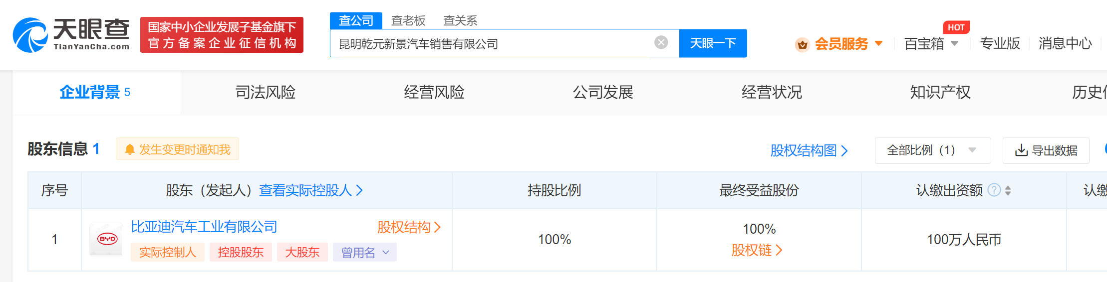 比亚迪在昆明成立汽车销售新公司,注册资本100万人民币
