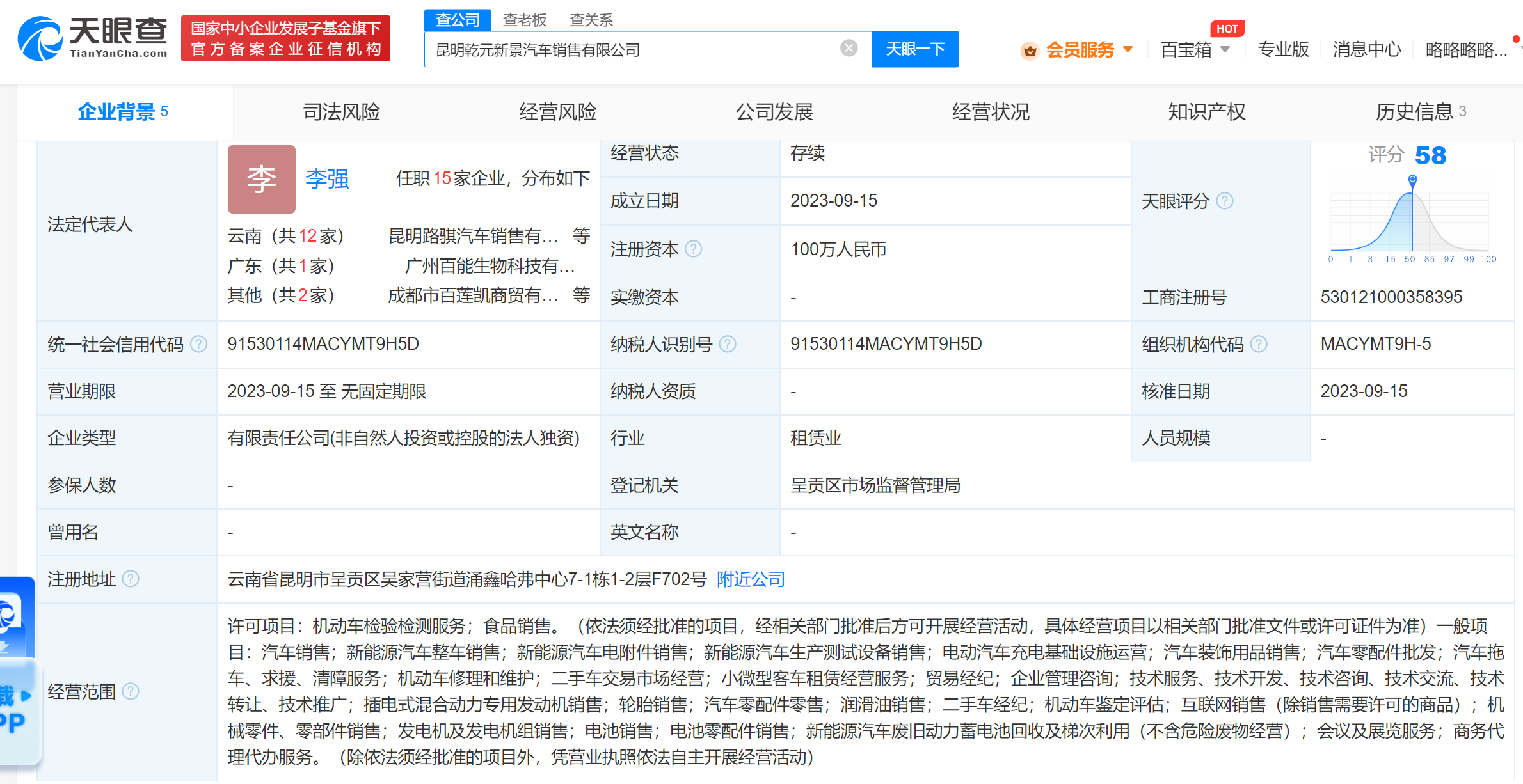 天眼查App显示,近日,昆明乾元新景汽车销售有限公司成立,法定代表人为李强,注册资本100万人民币,经营范围含汽车销售、新能源汽车整车销售、电动汽车充电基础设施运营、二手车经纪、电池销售等。