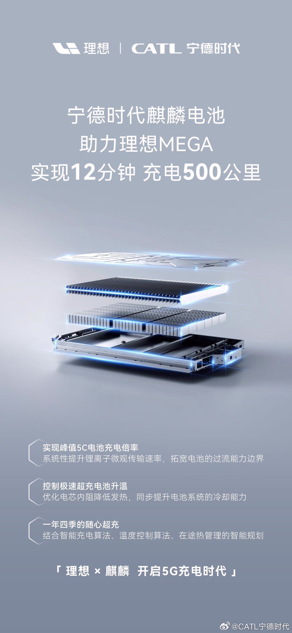 IT之家注意到,上个月宁德时代官微发文宣布,旗下“麒麟电池”可助力理想汽车首款纯电车型理想 MEGA 达成“12 分钟充电 500 公里”。宁德时代方面还称,理想 MEGA 搭载的电池可实现峰值 5C 电池充电倍率,能够系统性提升锂离子微观传输速率,拓宽电池的过流能力边界。同时,还支持优化电芯内阻降低发热、同步提升电池系统冷却能力等功能。