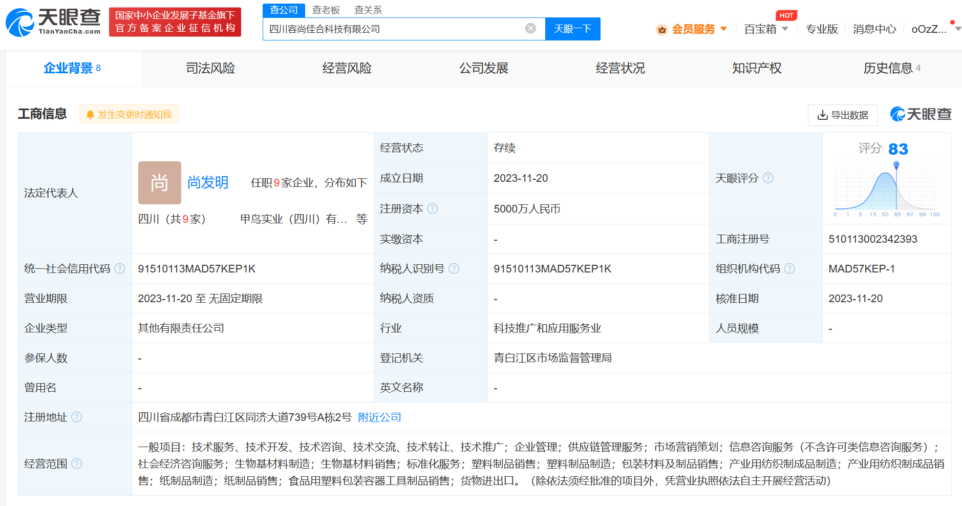 11月23日消息,天眼查App显示,近日,四川容尚佳合科技有限公司成立,法定代表人为尚发明,注册资本5000万人民币,经营范围含企业管理、供应链管理服务、社会经济咨询服务、生物基材料制造、标准化服务、塑料制品制造等。