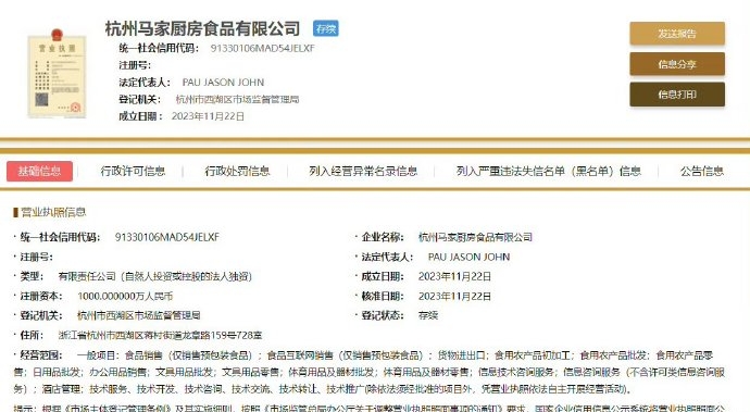 鞭牛士 11月23日消息,近日,鞭牛士查询国家企业信用信息公示系统网站,网站显示,11月22日,杭州马家厨房食品有限公司成立,法定代表人为PAU JASON JOHN,注册资本1000万人民币,经营范围含食品销售(仅销售预包装食品)、货物进出口、食用农产品批发、日用品批发、酒店管理、技术服务等。