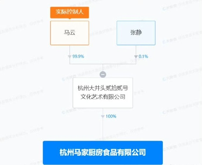 股权全景穿透图显示,该公司由杭州大井头贰拾贰号文化艺术有限公司全资持股,后者由马云持股99.9%。