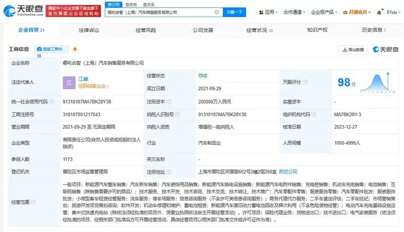 哪吒合智(上海)汽车销售服务有限公司成立于2021年9月,法定代表人为江峰,经营范围包括新能源汽车整车销售、汽车新车销售、充电桩销售、机动车充电销售、电池销售等,由众联天下汽车销售服务有限公司全资持股,后者为合众新能源汽车股份有限公司全资子公司。