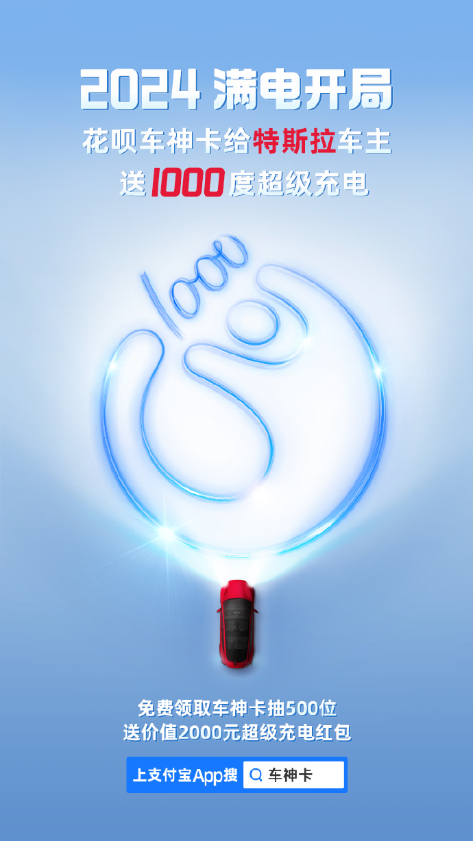 据悉,1月18日起,花呗官宣与特斯拉发起联合活动,为500位特斯拉车主送出1000度电的福利。车神卡是花呗近期上线的新业务,在支付宝内搜索「车神卡」,可以看到停车、加油、充电等车主权益福利。
