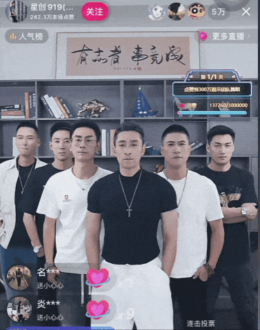 从内容形式上来看,团播就像男团女团+直播的杂交产物。5-10人成团唱跳的模式,就像把《创造101》的选秀现场搬进直播间,直接平替“消失的偶像综艺”。