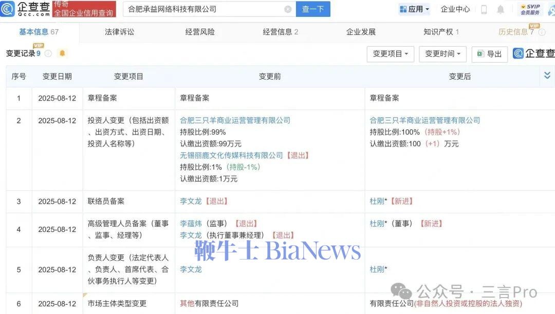 尤其是最近半个月,小黄更新十分频繁,10天就发了4条视频。能够看出,她要重新回来的影子了。其实,小黄就是其他徒弟们的模版,他们基本都把曾经签约三只羊的大号放弃了,在小号上也尽量不带三只羊的相关信息。比如嘴哥,800万的大号从去年9月停更,也是在今年6月份开了小号,目前已有近13万的粉丝,视频风格基本还是加入三只羊前的那套,健身+励志语录。8月12日,合肥承益网络科技有限公司发生工商变更,小杨哥徒弟李文龙(网红“嘴哥”)卸任该公司法定代表人、执行董事、经理,杜刚接任法定代表人,并担任董事,原股东无锡丽鹿文化传媒科技有限公司退出,同时部分主要人员发生变更。股东信息显示,该公司现由合肥三只羊商业运营管理有限公司全资持股。陈意礼也是从6月份在小号更新,分享穿搭和拍照技巧等。今年5月份,沉寂许久的三只羊旗下女主播七老板开启复播,但直播平台是在淘宝直播,依然带货美妆产品。经过这么长时间的休整,七老板换了造型,头发扎了起来,戴了大耳环,也变白了。值得注意的是,七老板淘宝直播账号的MCN是“明澄网络”。直播带货网红们退退潮也好,前些年太热闹又太乱了,该换换水了。(转载自:三言Pro)