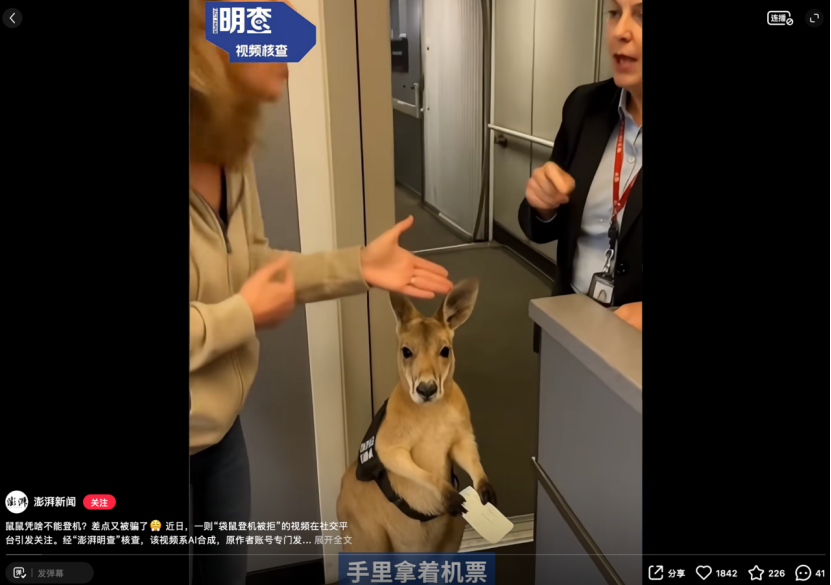 最绝望的是,老人不仅相信了还爱得不行,拿AI乖孙和真孙比。没想到都已经成年了,还得遭受“看看人家孩子看看你”的折磨,况且这次把你比下去的不是隔壁小李,而是空气。 这种震撼有两层。一层是惊讶,你以为的“一眼假”,其实只是你以为。一层是担忧,把AI内容被当成真的,被骗到的不仅是点击,还可能是感情甚至金钱。 现实也确实如此。 说两个极端例子。 一个例子是今年6月的时候,马来西亚有一对老夫妻在网上看到一则“记者走访”视频。视频中一名记者正在介绍某景区的缆车项目,于是他们说走就走,驱车4.5小时前往,却被当地旅馆员工告知根本没有缆车。 “我向阿姨解释说,这段影片是AI制作的,并不是真的。我在这里土生土长,如果真有缆车,这里一定比现在热闹得多。” 我们也专门找到这则视频,画面中有意为之的低画质,右上角的电视台标,配上“记者走访”这种形式和流畅的画面,缆车悠然穿越树林,溪流和山脉的壮丽景观,都极具迷惑性。 虽然可以通过一些动作和行人不自然地走姿看出端倪,但要精准地传达给一位老人“假”在哪里,还真不容易。 另一个例子是今年3月,中国工程院院士、天津中医药大学名誉校长张伯礼推荐某美白护肤产品的视频出现在网络上,他不得不出来辟谣:这些内容全是假的。我从来没用过这个护肤品,我也没做过这方面的宣传,更没研究过,所以里边完全是编造的。 当时网络上涉及他形象和声音的假视频在网络上传播的至少还有十几条。 道理都懂,但是给老人讲清楚又是另一回事,难度堪比解释为什么有人花三十万买那个龇牙咧嘴的玩偶拉布布。甚至有博主专门拍摄用AI工具合成“乖孙”的视频,就是方便大家转发给家中老人。 辨别能力有限的不止有老人,更不只是中国用户。YouTube上一位忧心忡忡的用户就分享说,自己的孩子看了一则短视频,是关于“游乐场恶魔”的,吓得不轻。她不得不费劲给孩子解释什么是人工智能,最后干脆禁止孩子再用YouTube。 AI标识变为标配,无疑是对在这方面辨别能力有限的群体的一种保护。至少可以告诉他们,凡是有“作品有AI内容”这样的标识,就别信以为真。 02 当年轻人也无法识别AI内容 除了单纯地担忧家人之外,年轻人自己也会直接变成“受害人”。 爷爷奶奶用AI乖孙PUA你,都已经算小意思,尝过长辈用AI催婚的人才知道什么是真正的苦涩。 “妈妈说了这番话,我想结婚了”“不结婚的人以后有多惨”“人到中年最可怕的事是孤身一人”“不结婚的十大坏处”,不知道什么时候开始,各种催婚视频变成了老人的“嘴替”。 更魔幻的是,你从明显的掉帧,以及“穿模”的牙齿,惊讶地发现如今催婚视频都在用AI了——原视频也许只是一段普通的街头采访,被人用AI一处理,就成了对口型文案点读机。 好歹以前营销号的催婚视频还是真人拍摄,如今就只动动小手指用AI搞deepfake?更有甚者,直接用AI猫猫成亲视频配催婚文案,就连你家猫看了都得连连摆手,为自己的物种发声。 真把老实人逼没辙了,年轻人开始用“魔法打败魔法”。 轻则让AI支招紧急学习反催婚话术;重则用AI合成自己和光头大金链子油腻男拥抱的视频,骗长辈“已经找到对象了,勿催”;或者直接合成猫猫洗衣做饭的视频,下次长辈再问“不生孩子老了怎么办”,你只需要说“请看VCR”——谁用AI不是用啊,年轻人还能自己制作,直接让自家猫猫上场。 不过在和家长斗智斗力的过程中,都还是愤怒的对抗,毕竟那些催婚视频,不管是猫猫结婚还是路人被对口型,都还是和老年人爱上的“AI乖孙”一样,是一眼假的视频。 当十级冲浪选手发现,连自己都会开始分辨不出AI视频和真实视频的时候,这一切才真的变成赛博恐怖故事。 这就不得不说到“袋鼠登机”视频了。今年5月,一则视频走红网络,获得百万点赞。视频中一位女士正在和工作人员理论,她们中间站着一只袋鼠,手里握着登机牌,一脸无辜地看着镜头。 由于没有明显的光影、动作、肢体硬伤,袋鼠的表情又实在惹人怜爱,很多人压根就来不及想“袋鼠能不能坐飞机”的问题,甚至注意不到女人挥舞的手露出了破绽,就冲到评论区疯狂键入“好可爱呀”。 最后发现小丑竟是自己,这是一则AI视频,甚至引来多家媒体帮忙辟谣。 不过在那之后,第三方视频还在转发这则视频,而评论区依然有“蒙鼓人(被蒙在鼓里的人)”。 这种事儿对年轻人的打击无疑是巨大的,上午还在跳脚“这么假的AI视频你为什么要相信”,下午就发现自己也分不出来:我三岁玩iPad,五岁玩电脑,十二岁就已经是冲浪满级选手,结果发现AI视频是不长眼的,作为人类的自信心是没有的,真与假的界限是模糊的。 好在AI标识来了,袋鼠再可爱,也别想骗我。 03 AI标识成标配,真的很有必要 AI的能力越来越强,真与假的界限在屏幕里逐渐变得模糊,人为划清这道界限就显得尤为重要。 这并不容易。 正如刚刚开始实施的《办法》,强制规范,AI生产商、平台、用户三方共同努力,意味着不留“视情况遵守”的灰色地带,也不留“猫鼠游戏”的空间,这样的力度在全球都实属罕见。 比较相似的是韩国和西班牙,前者有人工智能框架法,后者有AI标识要求,都是在今年年初的动作。 欧盟动作比较快,2024年正式公布《人工智能法案》(EU AI Act),不过这是一个针对AI比较大、全的法案,核心是人工智能规制分级管理,将人工智能系统分为“
