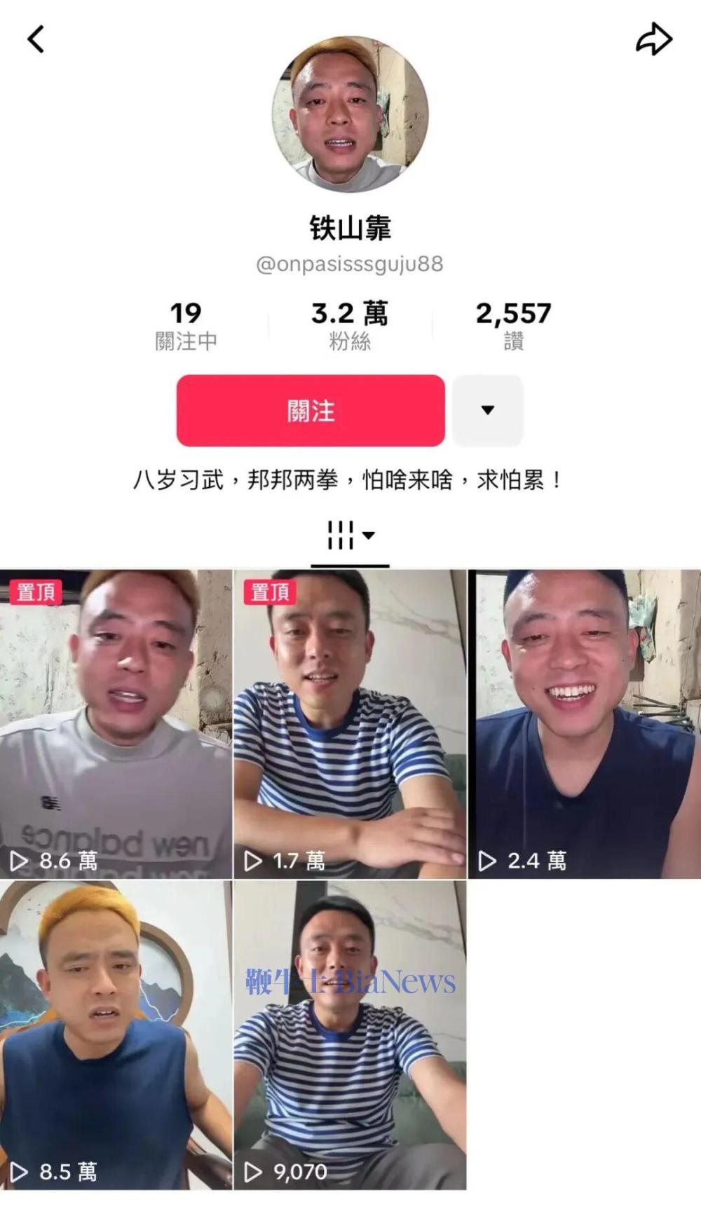 近日,有网友发现,2021年被封的千万网红铁山靠,在TikTok(抖音国际版)开通了个人账号,现下他的粉丝数量已经达到3.2万,主页发布了5条作品。