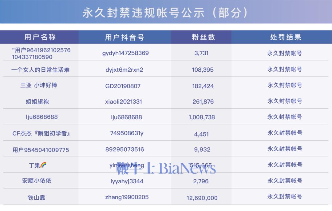 从抖音的永久封禁违规账号公示(部分)中可以看见,铁山靠当时的抖音粉丝有1269万,人气可以说是天花板那一档,足足甩了其他网红一条街。