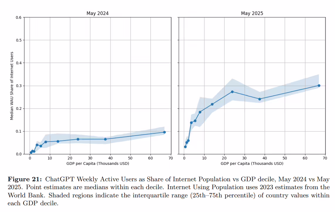 年龄分布方面,18 至 25 岁的年轻用户贡献了约 46% 的消息量,成为最活跃群体。地域数据则显示,在人均 GDP 1 万至 4 万美元(现汇率约合 71209 元至 28.5 万元人民币)的低中收入国家,ChatGPT 的普及率增长速度是高收入国家的 4 倍,反映其在新兴市场的快速渗透。