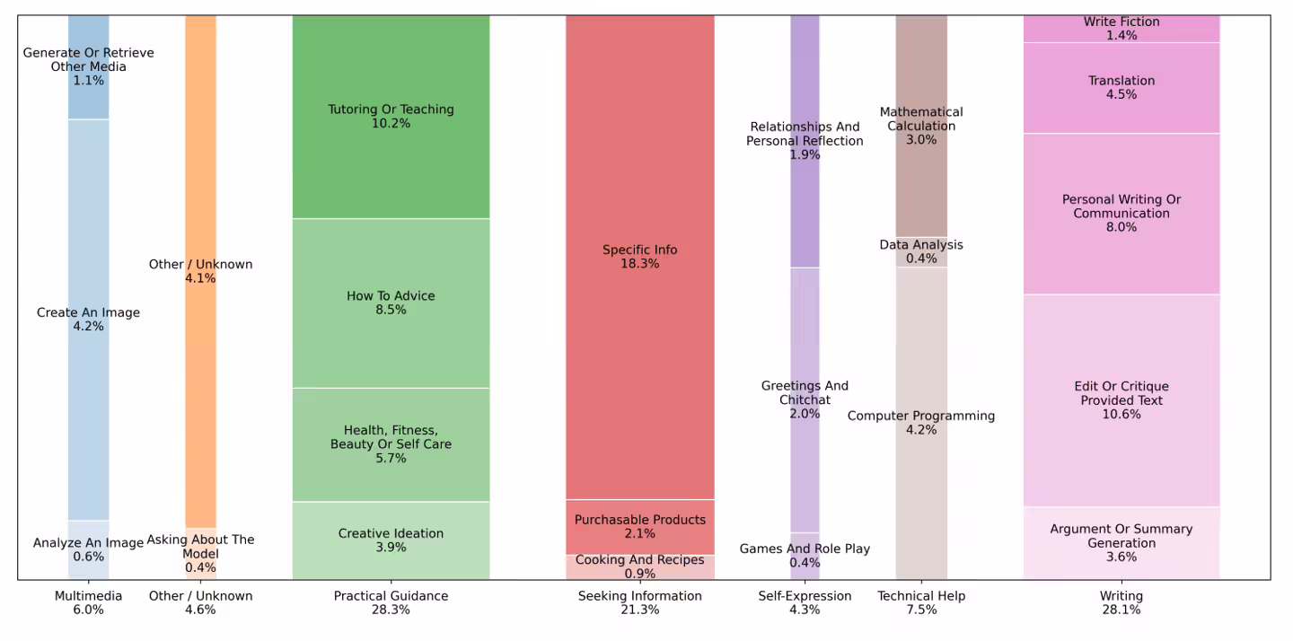 在使用话题方面,最常见的三大类为“实用指导”、“信息查询”和“写作”,三者合计占所有对话的 78%。其中,写作是工作相关任务的首要用途,占比为 40%。教育用途占所有信息的 10.2%,个人关系咨询不足 2%。
