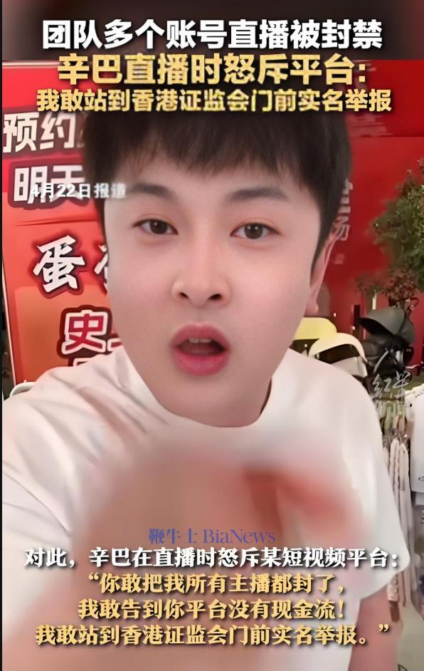 去年4月,由于辛巴及团队多个账号遭遇快手封禁,辛巴在直播时直接怒斥快手平台:“你敢把我所有主播都封了,我敢告到你平台没有现金流!我敢站到香港证监会门前实名举报。”