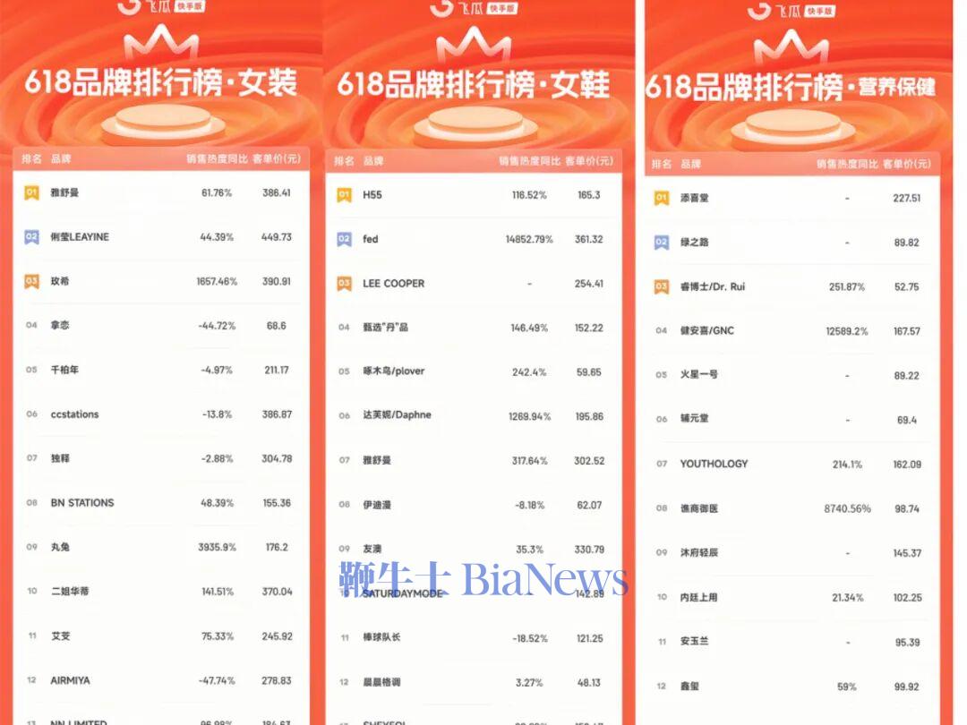 再看女装,2024年和2025年618,快手女装销售榜的Top1品牌岿然不动,一直是雅舒曼,这个品牌是快手网红自创品牌,事实上不止雅舒曼,整个2025年618女装上榜商家,几乎没有所谓的传统知名品牌。