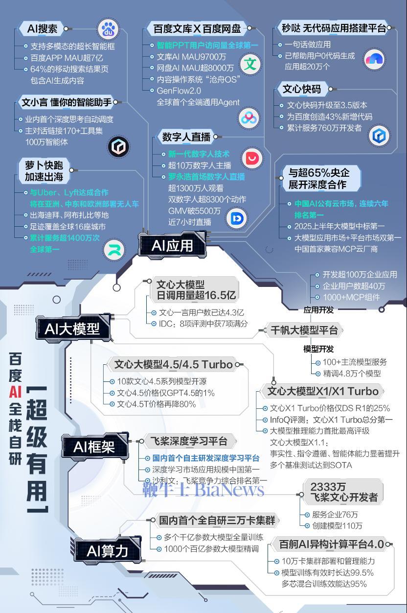 一场深刻的自我革命,必须从最核心的业务开始。对于百度而言,这场由AI驱动的重构,是一场从根基到前沿、由内而外的系统性变革。 变革的起点,是百度的基础业务——搜索。 李彦宏是国内最早提出“AI重构”概念的企业家,而他对搜索的思考,甚至可以追溯到2009年提出的“框计算”理念。 如今,这一设想在大模型的驱动下成为现实。2025年7月,百度搜索迎来了十年来最大规模的改版,传统的搜索框升级为无所不能的“智能框”,它支持超千字的长文本输入,还能直接在框内完成AI写作、AI作图等创作任务。 凭借全面的革新和庞大的生态(已接入超过1.8万个优质MCP),百度AI搜索在IDC的评测报告中,总分排名中国第一。 对核心业务的成功改造,为百度将其AI能力全面注入产品矩阵提供了信心和路径。而在决定竞争力的底层模型战场上,百度始终稳居国际领先大模型的第一梯队:文心大模型 X1.1在多项基准测试中击败DeepSeek,比肩GPT-5;ERNIE-4.5-21B-A3B-Thinking 开源模型则一举登顶Hugging Face全球榜单,成为国产模型突破的新标杆。 拥有超10亿用户的百度网盘和沉淀了14亿专业文档的百度文库,成为了重构的下一站。它们不再是单纯的存储工具,而被重构为“一站式AI内容服务与创作平台”。 智能PPT功能的月访问量超过3400万,位列全球第一。基于两者打通诞生的通用智能体「GenFlow2.0」,3分钟即可并行完成超过5项复杂任务,生成速度超主流产品10倍。 这些原生AI工具的成功,让百度网盘APP在最新的AI产品榜中位列国内总榜第一、全球总榜第二,仅次于ChatGPT。 真正的技术革命,不止于改造旧世界,更在于创造新世界。 在物理世界,是自动驾驶“萝卜快跑”。截至2025年第二季度,其单季出行服务量已超220万次,同比增长148%,累计全球出行服务次数超1400万,稳居世界第一。其第六代无人车成本已降至20万元人民币,远低于竞争对手Waymo,展现出强大的商业化潜力。 数字世界里,则是以慧播星为代表的AI数字人。罗永浩数字人直播带货GMV突破5500万元。这背后是百度AI全栈式数字人直播解决方案的技术支撑,它能将商家的开播成本降低80%,转化率提升31%。 这一切看似不同赛道的创新,都生长于同一片土壤。这种“一夜花开”的收获,实际上源于长达十余年的深耕。 自2013年在硅谷正式建立研究院起,当年的中国科技公司仍处在O2O电商和内容分发的竞争红海中时,百度就已经开始在人工智能领域进行系统性投入。这份超前的战略定力,最终沉淀为今天覆盖芯片、框架、模型到应用的完整技术闭环,以及超过1700亿元的累计研发投入。 在过去很长一段时间里,这种“重研发、慢回报”的模式并未被资本市场完全理解。市场的聚光灯追逐的是一个个风口,而百度却在默默构建着水电煤一样的基础设施。 如今,产业的潮水方向发生了根本性的改变。当全球AI产业从模型参数的虚幻比拼,转向应用价值的坚实创造,市场也随之进入了深度的反思阶段。 潮水退去之后,真正的价值投资规律开始回归,市场第一次如此迫切地寻找那些不仅有模型、更有场景、有入口、有生态的玩家。 正是在这个时刻,百度对长期技术战略的坚定践行,其光芒不再被短期的市场波动所遮蔽。它在算力、算法、应用和生态上的每一个布局,都精准地回应了当前市场的核心诉求。人们蓦然发现,百度耗费十年光阴构建的AI基础设施,正是通往AI应用时代的“标准答案”。 因此,与其说是百度单方面地选择了时代,不如说是产业发展的必然规律最终选择了百度。 这是先行者应得的收获。对于百度而言,一个关于AI的更宏大的长期主义叙事,才刚刚拉开序幕。(转载自全天候科技)