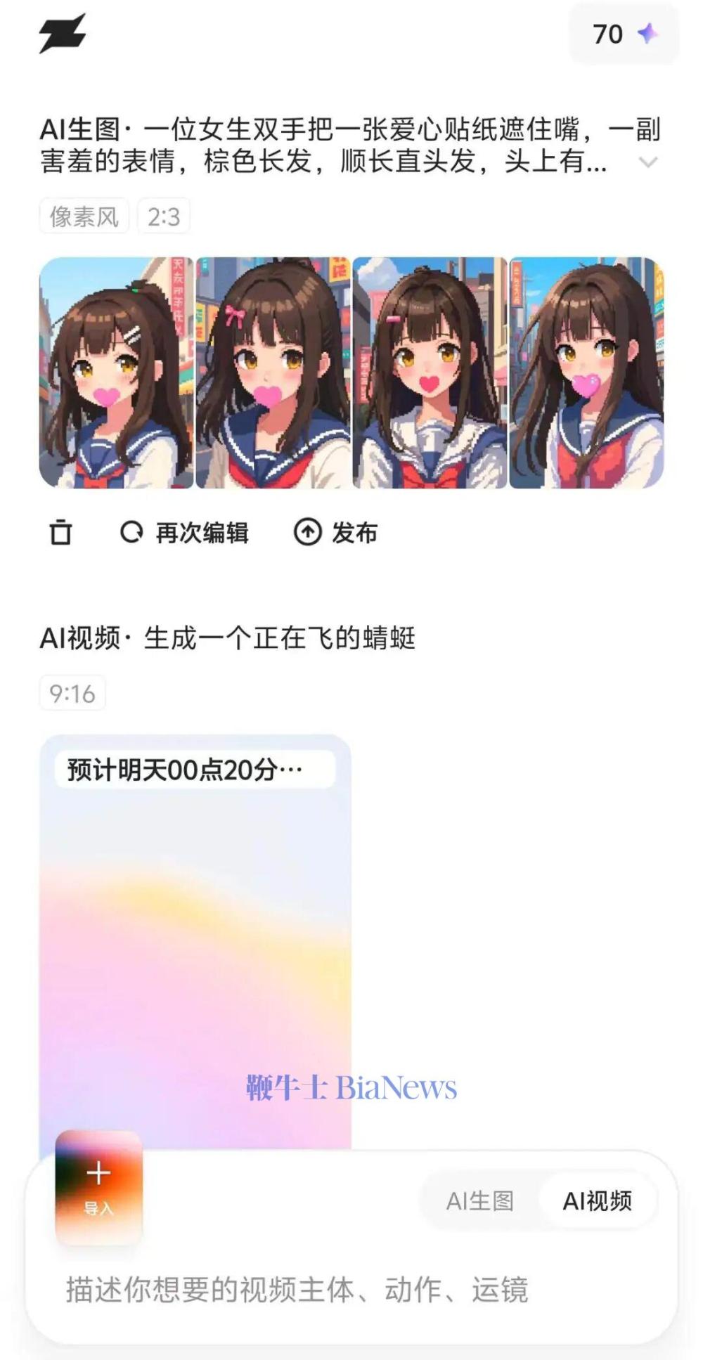 其二,AI视频创作:把用户的提示词或思路转化为鲜活生动的动态画面。比如输入“生成一个正在飞的蜻蜓”的视频,AI预估会在40分钟后出结果,用户在生成前,可以调整视频的成片比例,以及勾选智能润色和智能音效等。