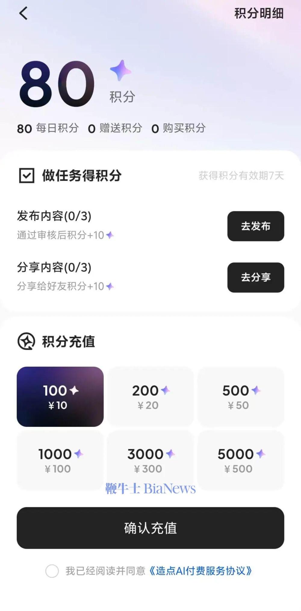 需要说明的是,通过造点AI每次生成一个视频需要支付10积分,积分可以通过任务获取,或者付费购买,10元可以购买100积分,以此类推。