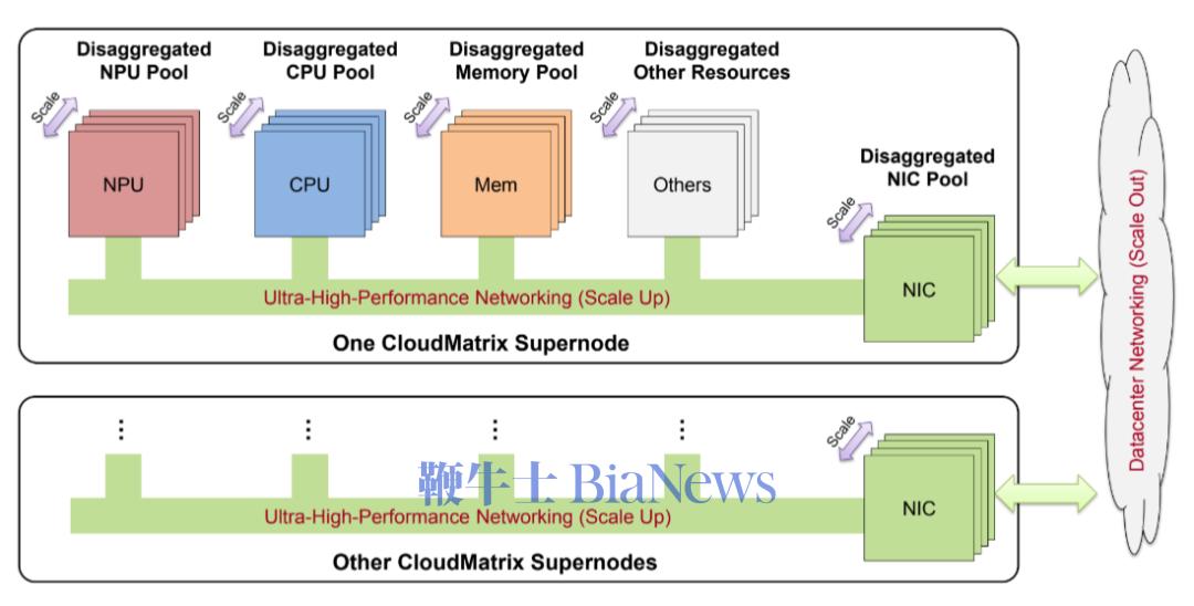 CloudMatrix384通过Ultra-High-Performance Networking实现了 CPU、NPU、内存、网卡(NICs)以及其他资源的完全点对点解耦与池化,其点对点硬件架构,包含用于超节点内扩展的超高带宽统一总线(UB)、用于超节点间通信的 RDMA ,以及用于与数据中心网络集成的虚拟专有云(VPC)。这再次证明,通信技术本就是华为的核心优势。