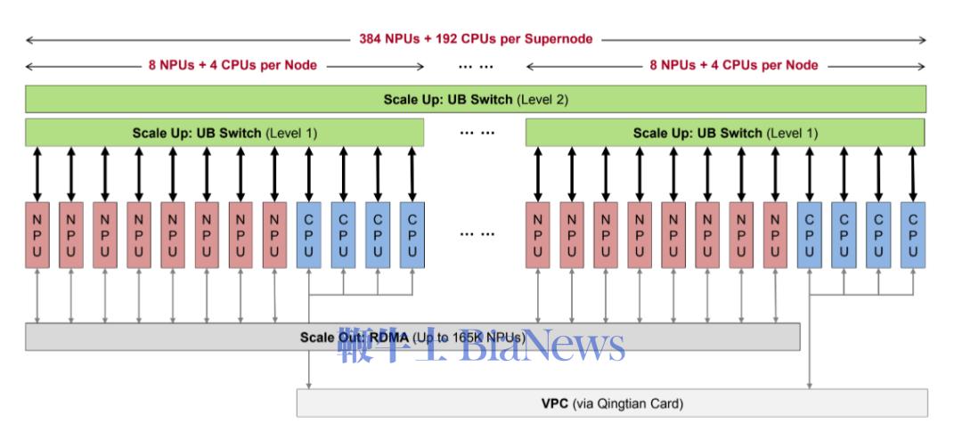 WAIC期间,超节点是AI基建的重头戏。其中,华为的CloudMatrix384成为了亮点,它的显著特征是其点对点、全互联、超高带宽的网络,通过 UB 协议连接所有的 NPU 和 CPU。