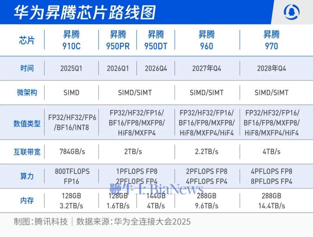 在2025年华为全连接大会上,华为发布了多款重磅芯片新品,包括昇腾950系列、960以及970等AI芯片,并公布了未来三年的昇腾AI芯片产品路线图。