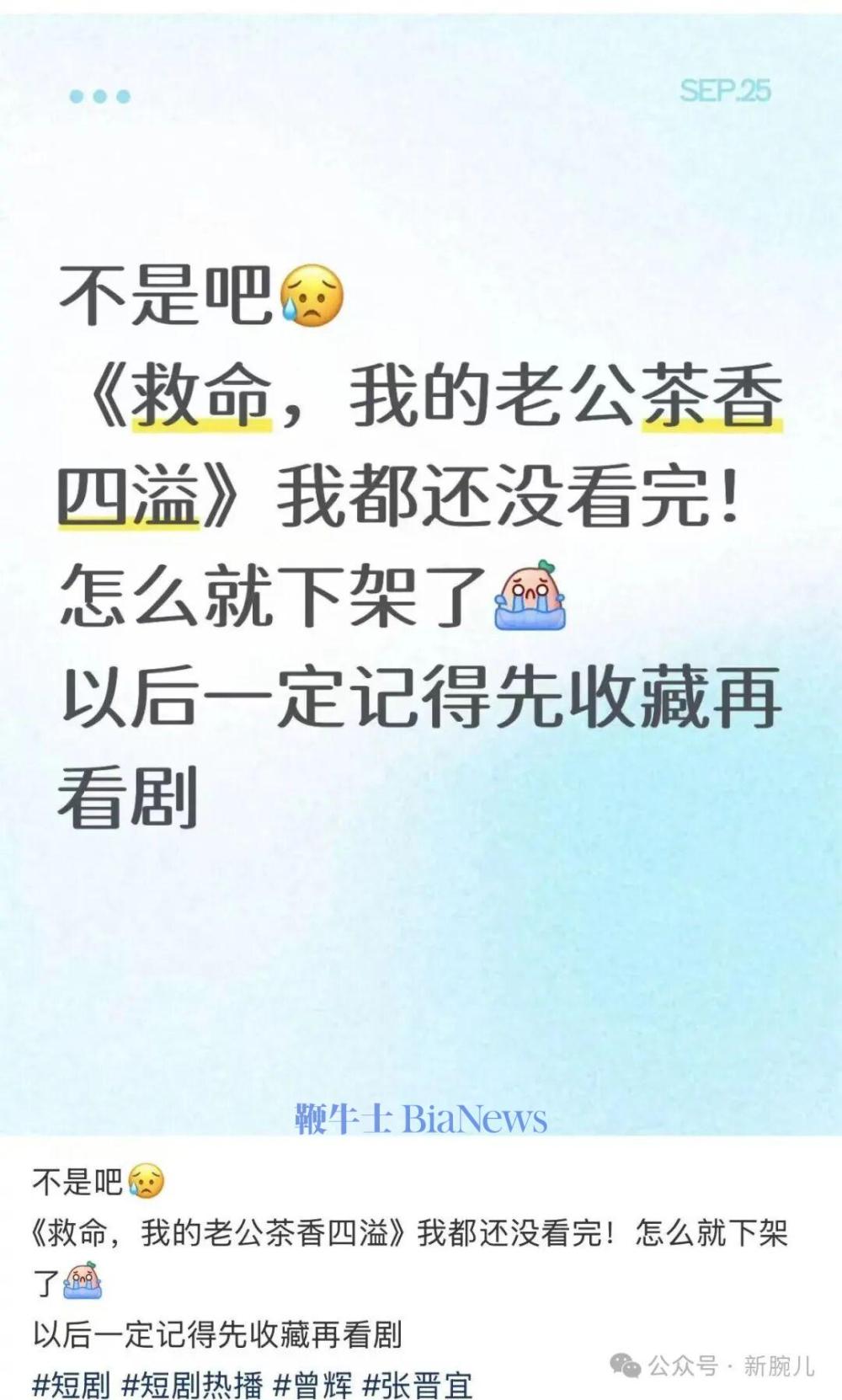 9月25日消息,小红书上多位用户反映红果上线的《救命!我老公茶香四溢》被下架了。