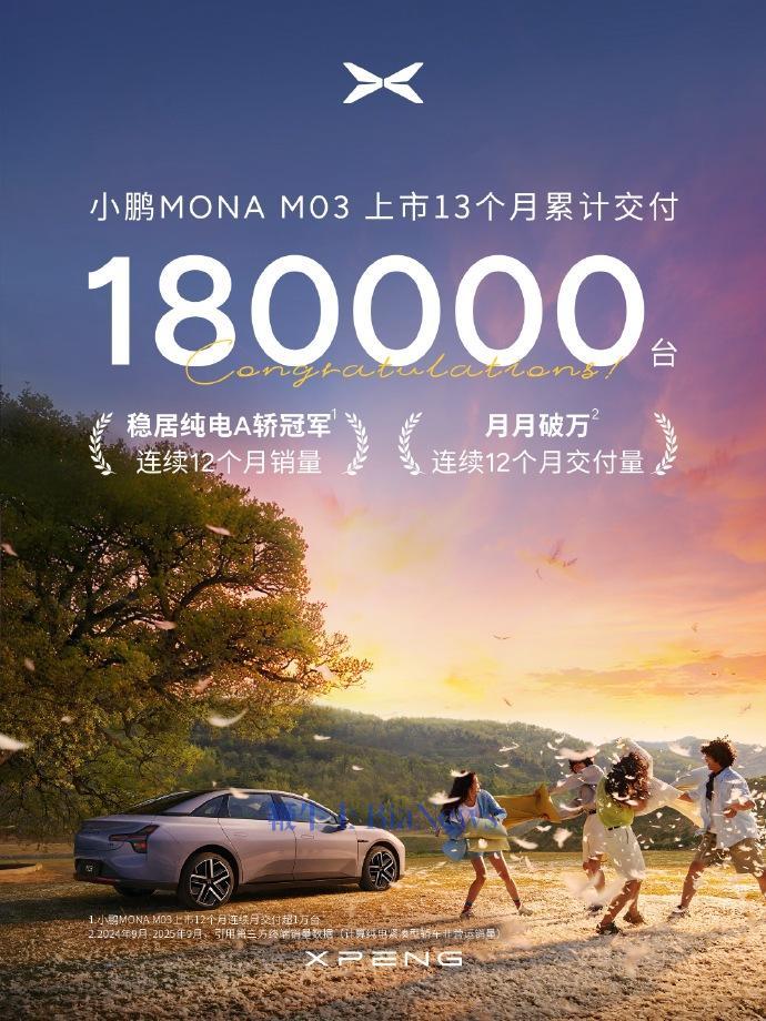 今日,小鹏汽车官方宣布,小鹏MONA M03已累计交付180000台。