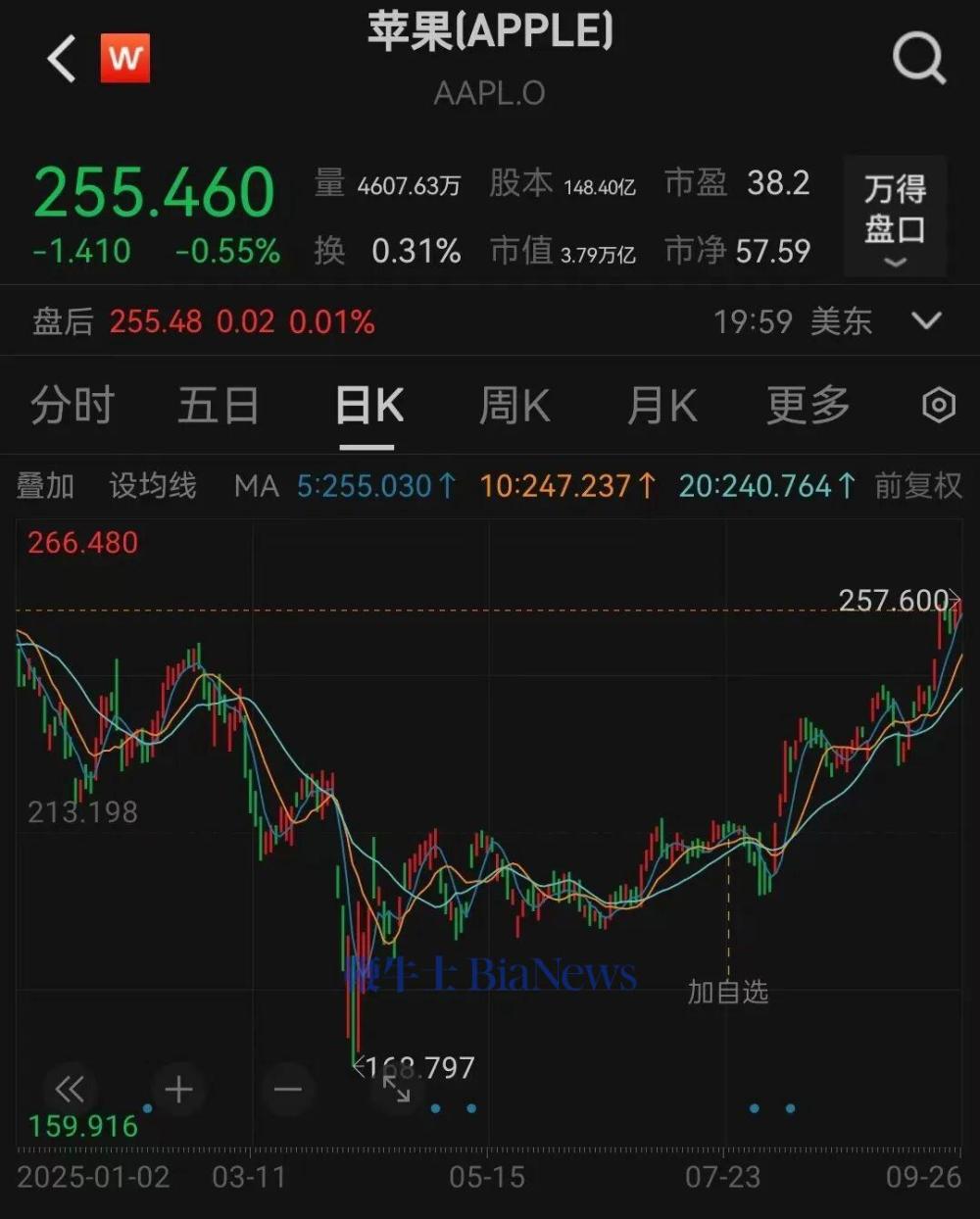 当地时间9月26日,苹果公司盘中创年内新高,截至发稿,苹果股价报255.46美元/股,市值约为3.79万亿美元。这家消费电子巨头本月的累计涨幅超过10%,距离历史新高只差不到2%。