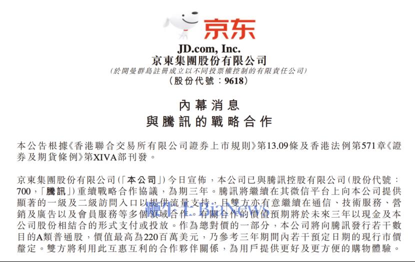 不过,京东表示,双方并不是不合作。除了在原有的广告、会员、流量、数据等领域合作外,京东还将与腾讯探索新的合作领域。目前,腾讯持股京东约2.3%。