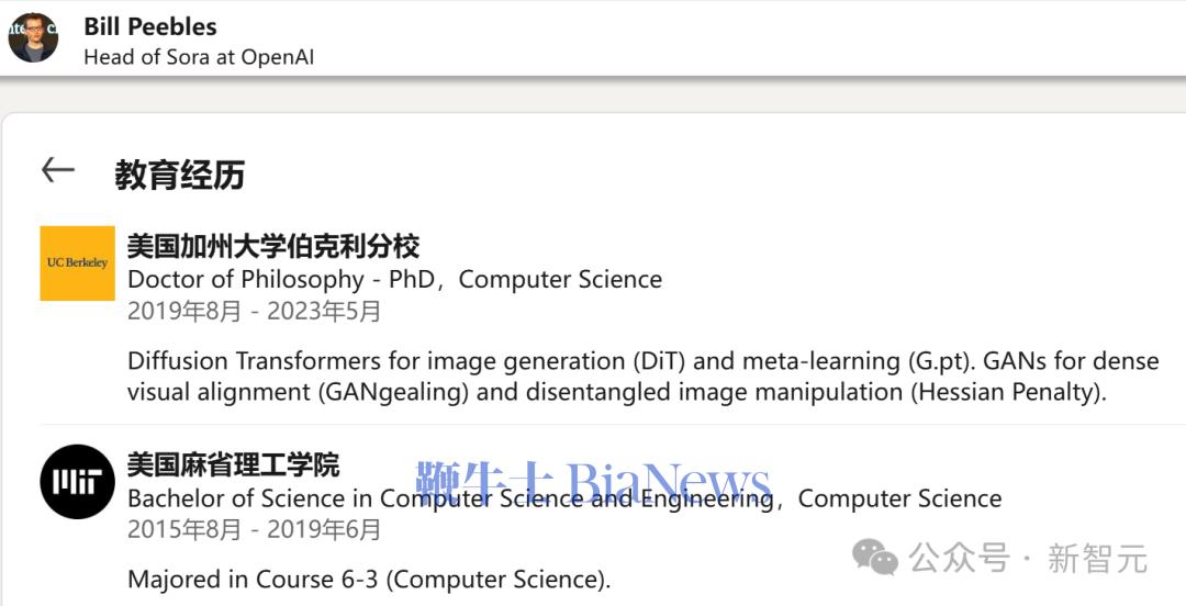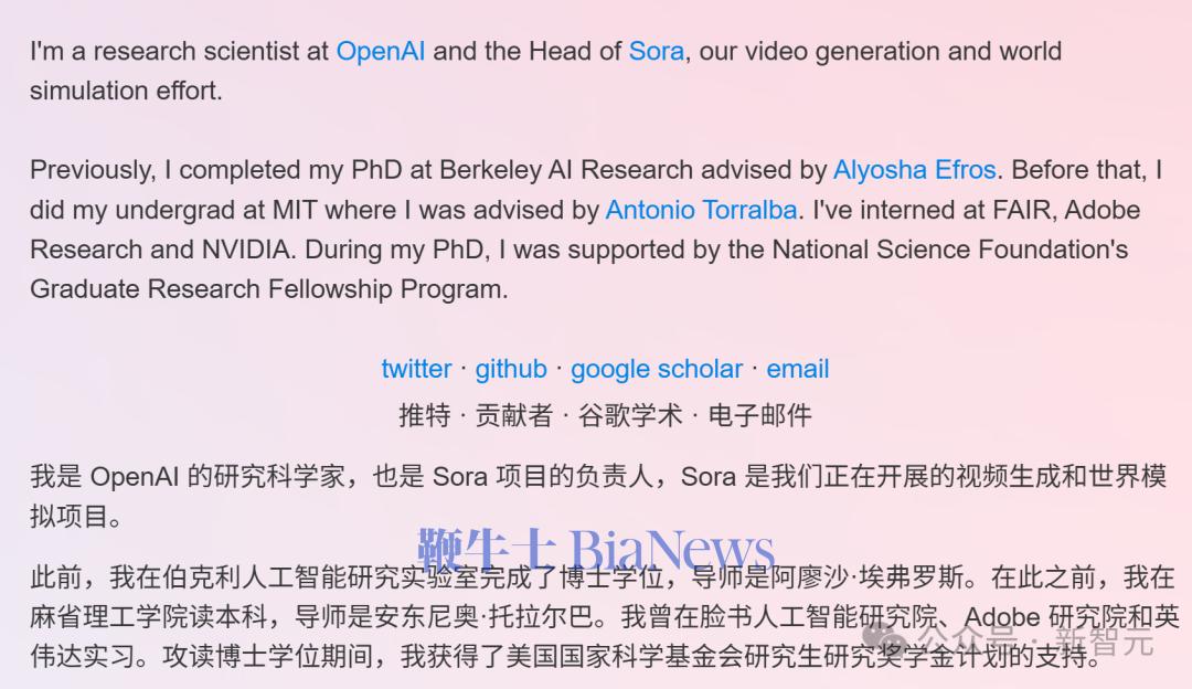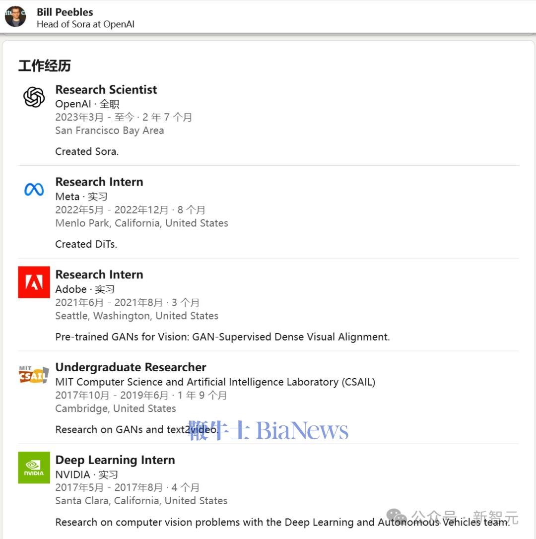 他曾先后在英伟达、Adobe、Meta的AI岗实习,博士毕业后直接加入了OpenAI,工作的最大业绩是Created Sora(创造出了Sora)。