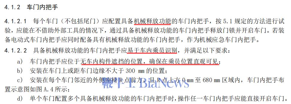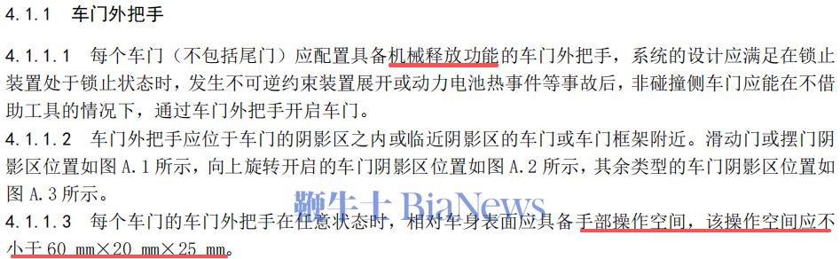简单来说,这回新国标的重点无非就这么几条,首先,新规明文规定了车门外把手应该具备机械释放功能,电子开启的全军覆没。