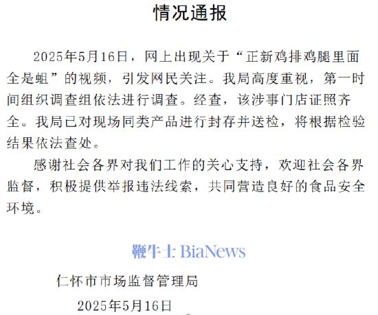 虽然正新鸡排价格正在上涨,但卫生质量却仍然堪忧。今年5月,有网友发布视频称,顾客购买正新鸡排的鸡腿后发现了大量的蛆。对此,涉事门店店员表示,“顾客早上买下午才来退,当时报警了。已对顾客赔偿,视频是围观者拍摄,不是购买者本人拍摄。”事件发酵后,仁怀市市场监督管理局迅速介入调查,对店内同类产品实施封存并送交检测。