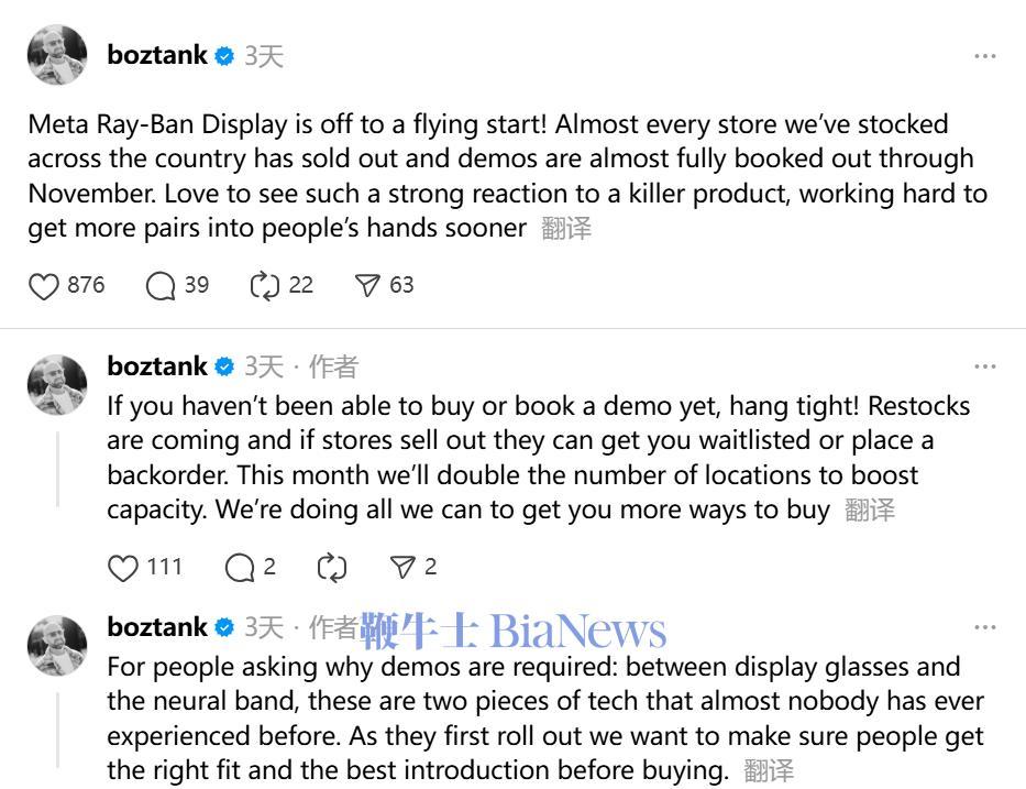AI眼镜的热度正持续上升。近日,Meta首席技术官安德鲁·博斯沃思(Andrew Bosworth)在Threads上发表文章称,Meta Ray-Ban Display智能眼镜在全国各地的线下零售店几乎全部售罄,11月之前的试戴预约也几乎全部排满。