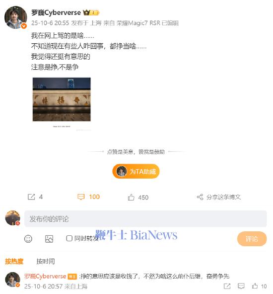 新浪科技讯 10月7日上午消息,荣耀首席影像工程师@罗巍Cyberverse 近日因在微博上公开辱骂网友引发争议,他昨日晚间发文疑似回应此事,认为自己遭遇了水军。