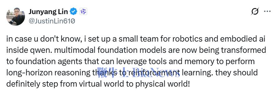公司在大模型部门 通义千问 内组建了一个新的“小队”——机器人与具身智能团队。消息的源头不是官方通稿,而是阿里高管林俊旸在 X 上的一句话:“多模态模型正变成能处理长时序推理任务的基础智能体,而这些智能体——理应从虚拟世界走向物理世界。”
