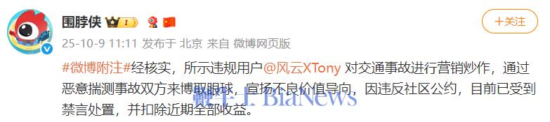 “围脖侠”发文称, 经核实,用户“风云XTony”对交通事故进行营销炒作,通过恶意揣测事故双方来博取眼球,宣扬不良价值导向,因违反社区公约,目前已受到禁言处置,并扣除近期全部收益。