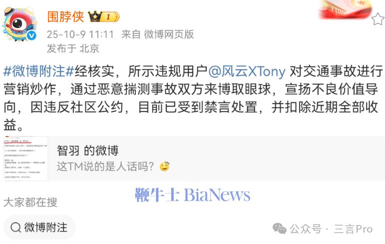 10月9日,“围脖侠”发文称,经核实,博主“风云xtony”对车评人陈震的交通事故进行营销炒作,通过恶意揣测事故双方来博取眼球,宣扬不良价值导向,违反了社区公约,故作出禁言处置。