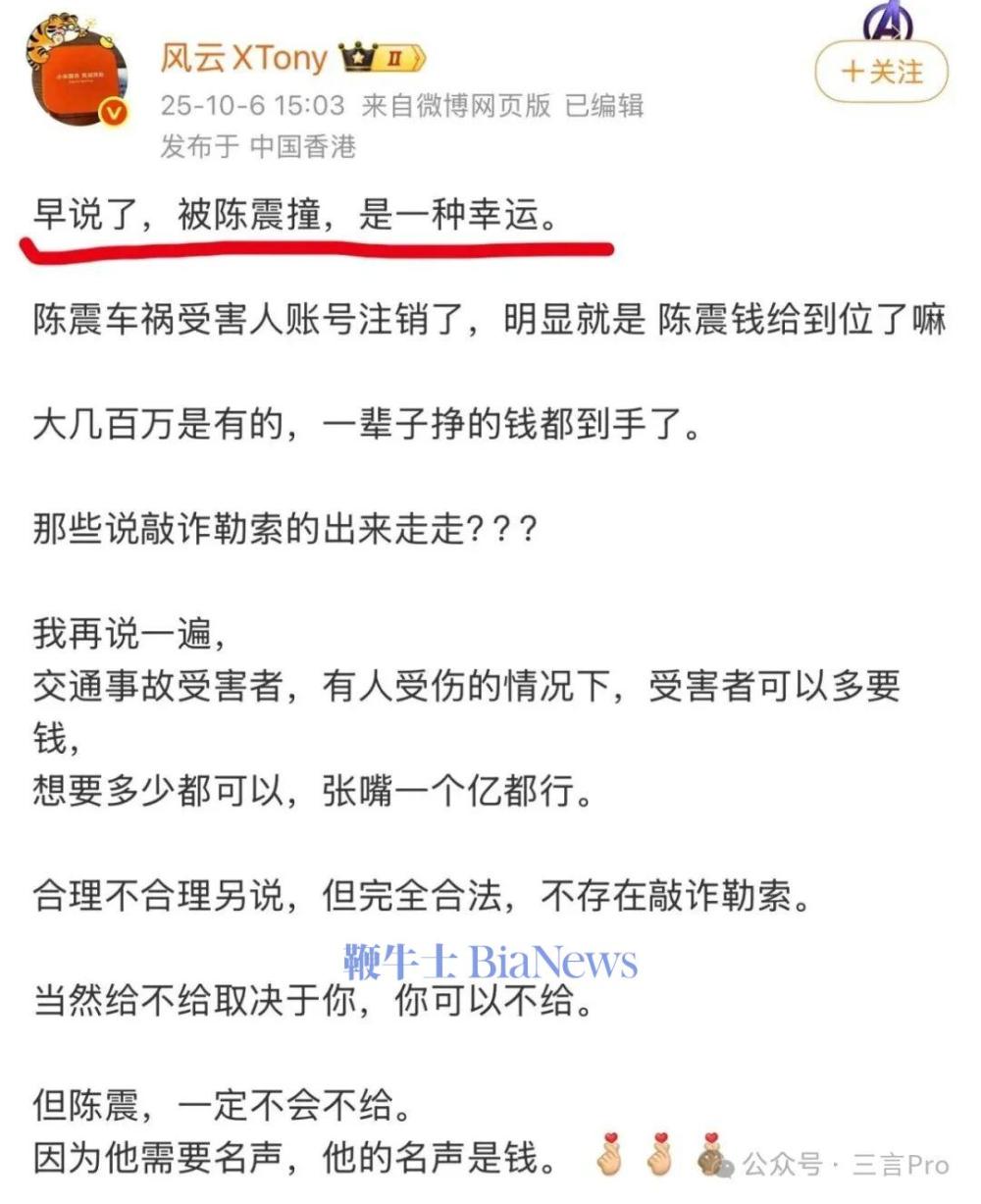 10月6日,“风云xtony”曾发文称:“早说了,被陈震撞,是一种幸运。陈震车祸受害人账号注销了,明显就是陈震钱给到位了嘛,大几百万是有的,一辈子挣的钱都到手了。”