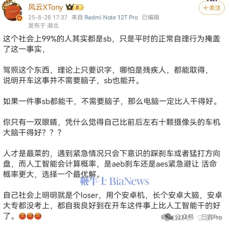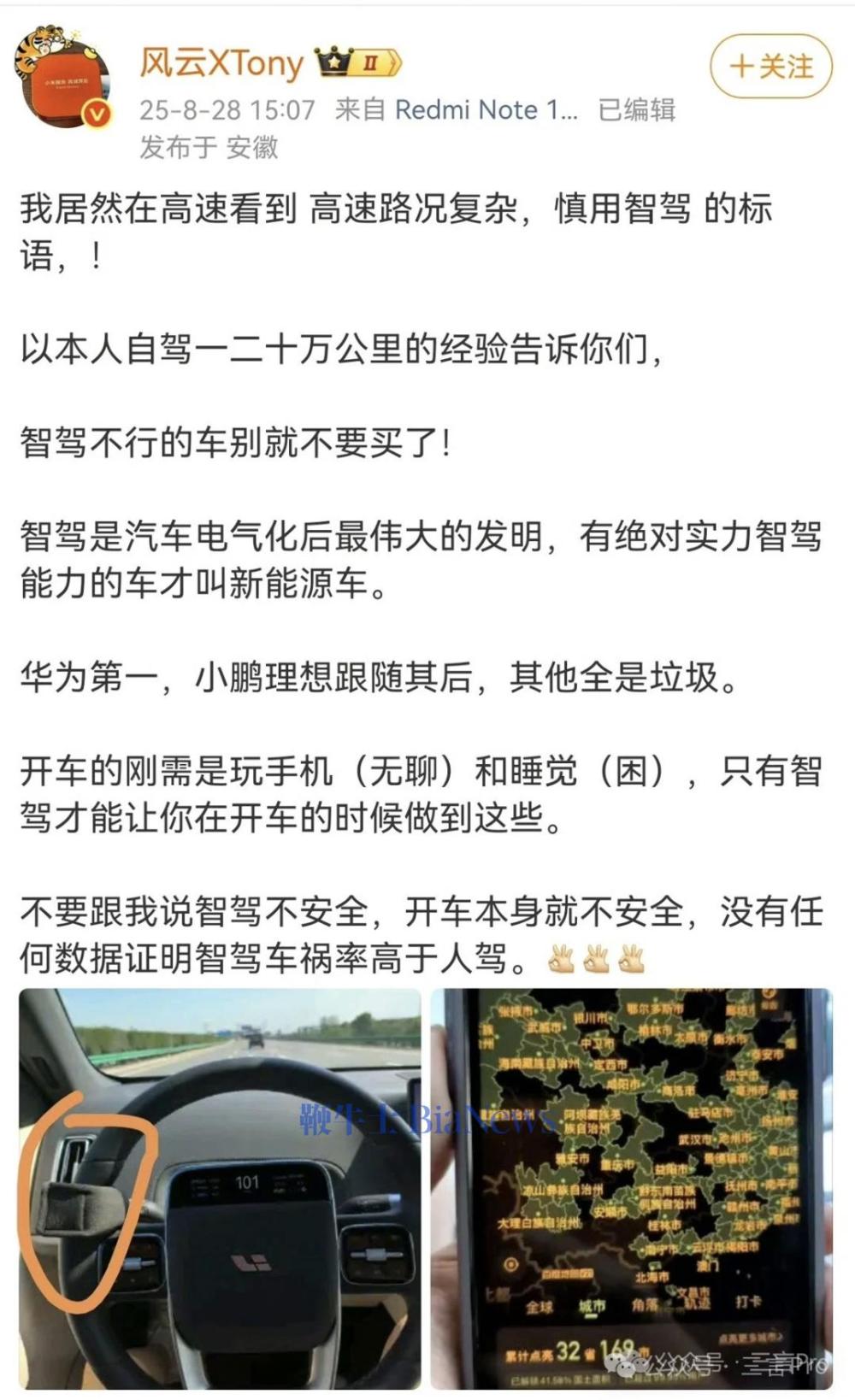 今年8月28日,“风云xtony”曾发微博称,在高速上看到了“高速路况复杂,慎用智驾”的标语,感到不可思议。