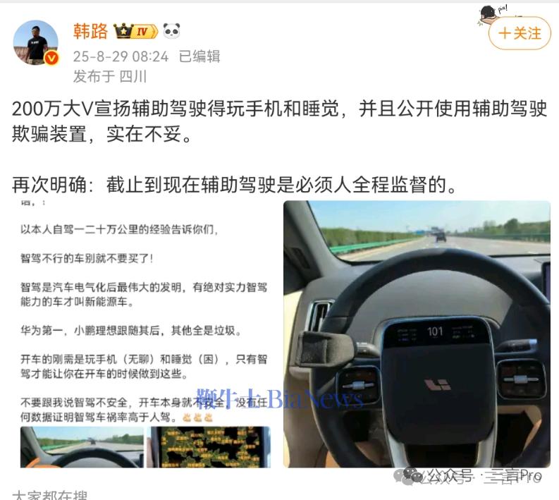 8月29日,汽车博主韩路对“风云xtony”的言论进行了驳斥,指出其宣扬在辅助驾驶开启时玩手机和睡觉,还使用辅助驾驶欺骗装置,这种行为十分危险且不妥。